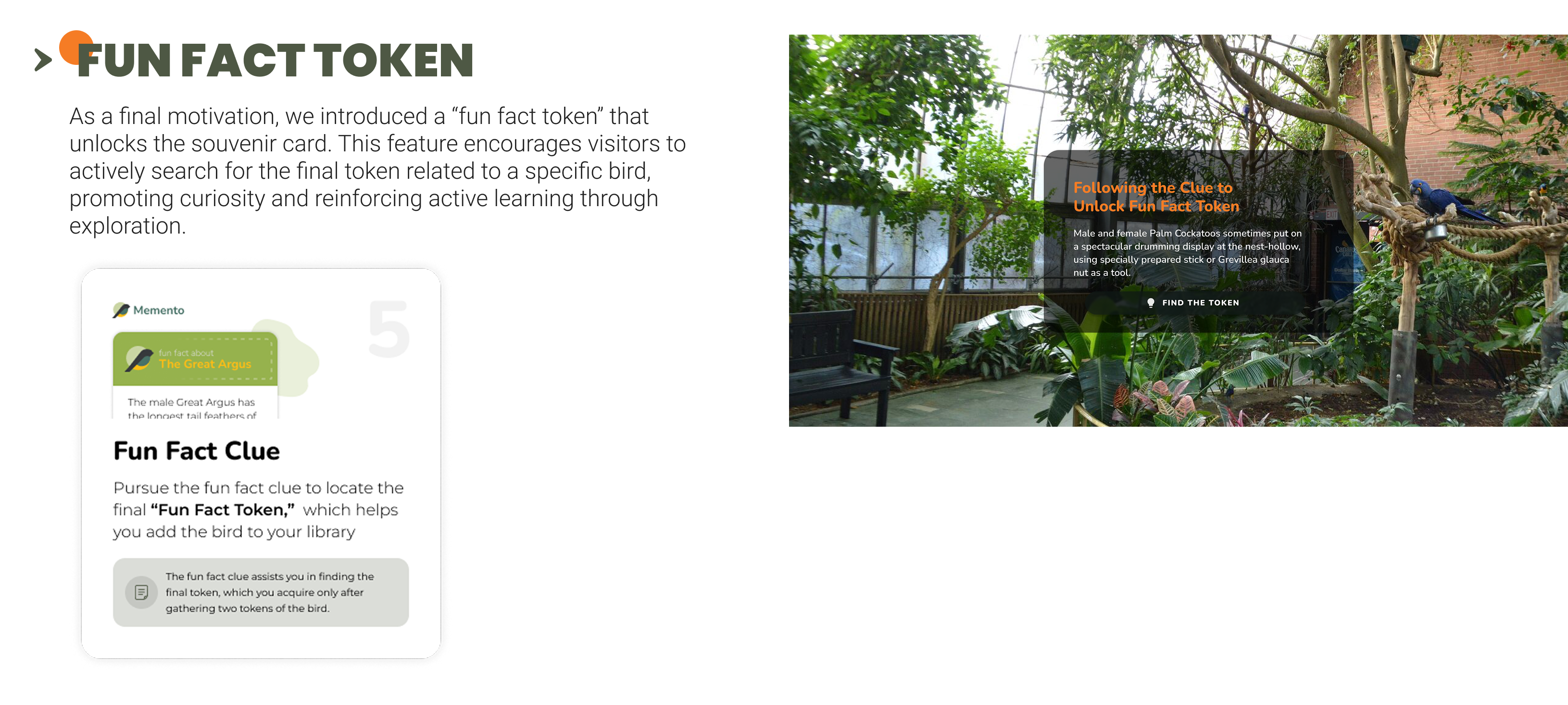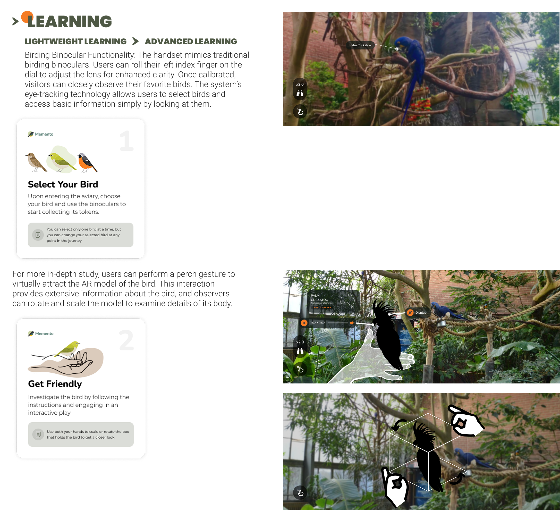The designed experience begins with an onboarding process to facilitate swift acclimatization to the advanced MR technology, encompassing gestures, library features, and settings. Following this introduction, visitors are guided to observe birds using MR headsets, allowing them to interact with and learn about avian species. The gamified user pathways are crafted to motivate visitors to seek out tokens and compile a comprehensive bird library.