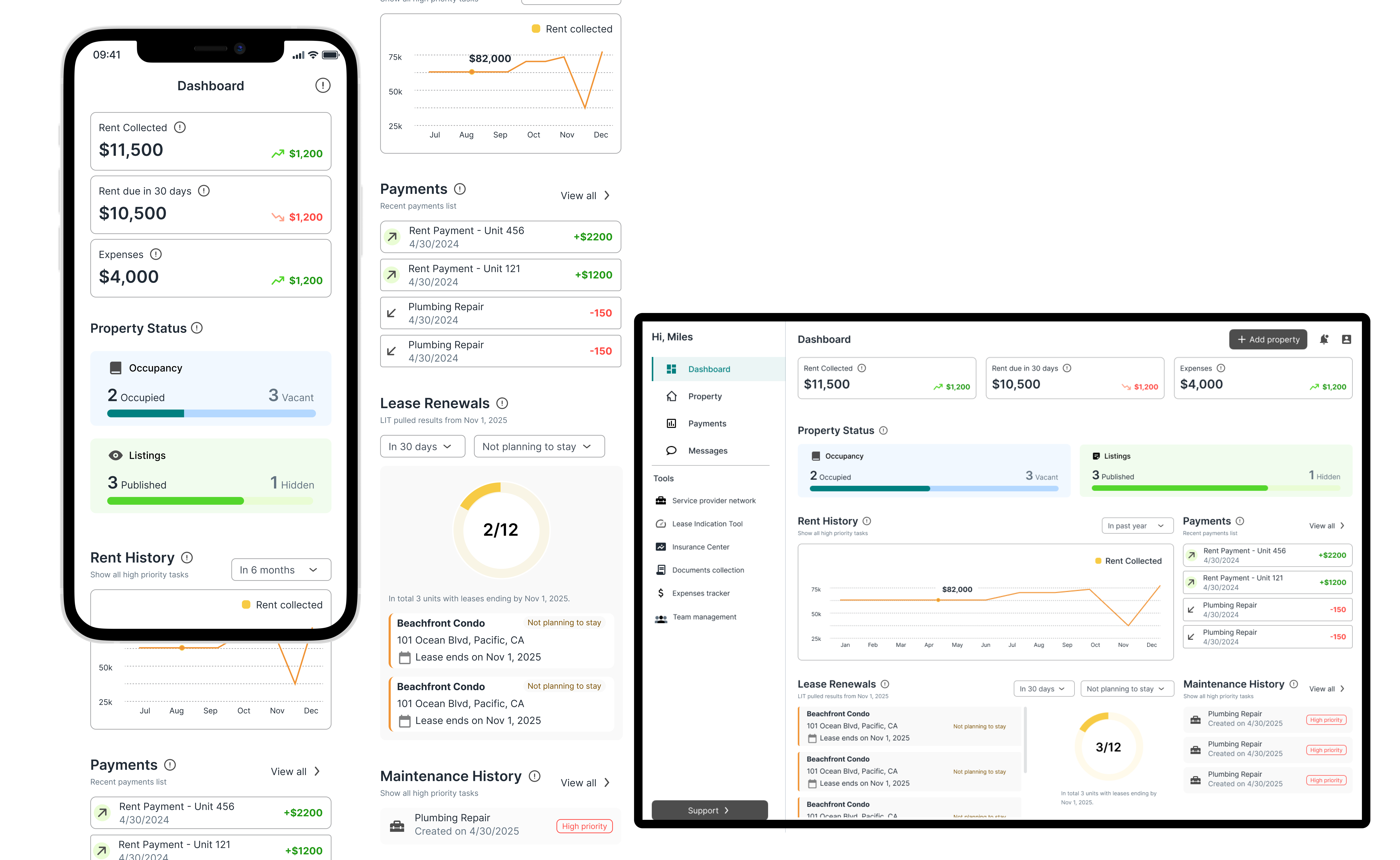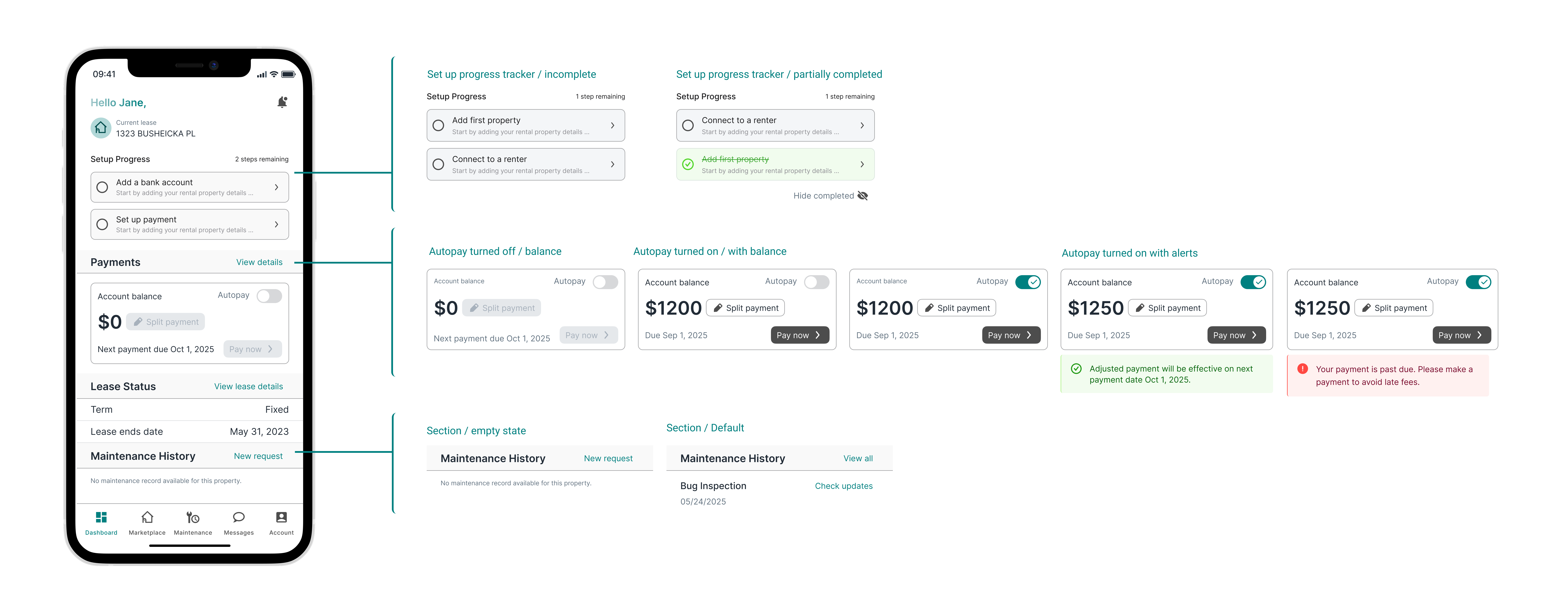 Because renters and landlords engage with payments in fundamentally different ways, I tailored each experience to match their priorities. Landlords focus on monitoring and managing payments, whereas renters value clarity and a simple, frictionless way to pay.